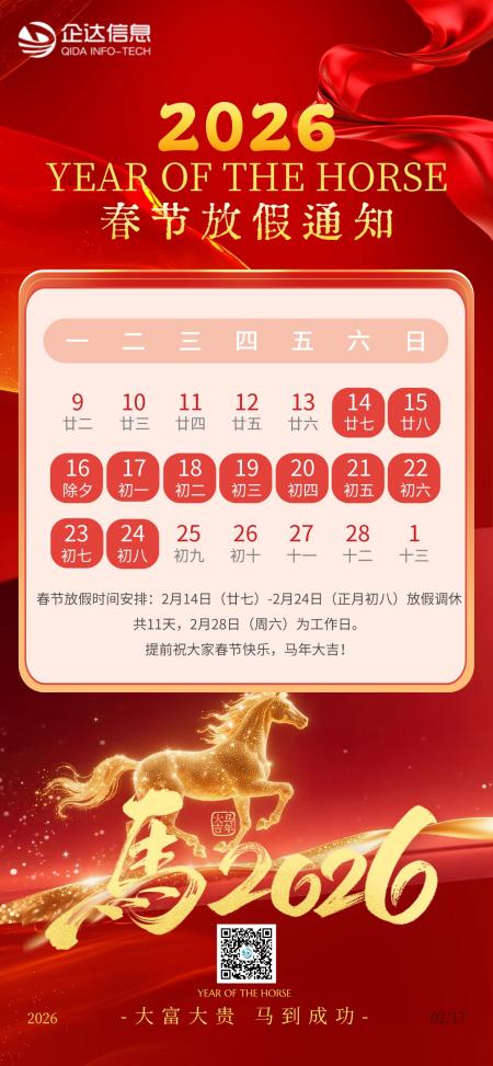 感谢您一直以来对企达信息的信赖与支持,至此春节来临之际,祝您春节快乐!现将我公司春节放假安排告知如下,如您节假日期间有紧急事宜,可联系对应接口人获取技术支持(售后服务电话:13750811409、18758911727)